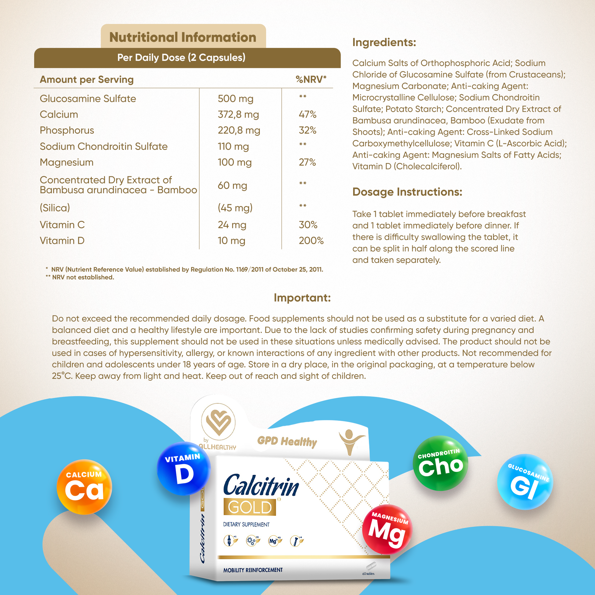 Calcitrin GOLD is a comprehensive dietary supplement that supports bone and joint health. It combines calcium, glucosamine, chondroitin, vitamin D, magnesium, and vitamin C to promote strong bones, flexible joints, and healthy cartilage.
